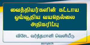சகல அரச வைத்தியர்களினதும் ஓய்வுபெறும் வயதினை 63 ஆக நீடித்து அதிவிசேட வர்த்தமானி அறிவித்தல் வெளியிடப்பட்டுள்ளது.