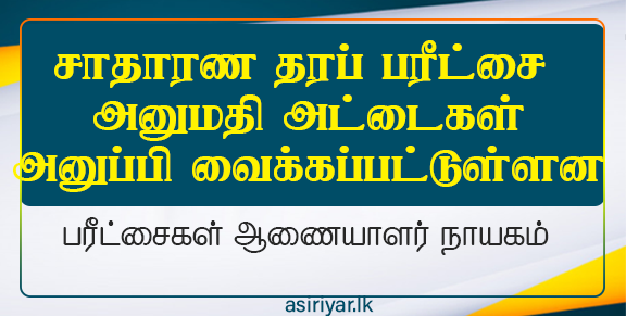 பாடசாலை விண்ணப்பதாரிகளின் அனுமதி அட்டைகள் அதிபர்களுக்கும் தனிப்பட்ட விண்ணப்பதாரிகளின் அனுமதி அட்டைகள் அவர்களது முகவரிகளுக்கும் அனுப்பி வைக்கப்பட்டுள்ளதாக பரீட்சை ஆணையாளர் நாயகம் அமித் ஜயசுந்தர குறிப்பிட்டுள்ளார்.
