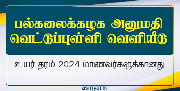 2024 க.பொ.த உயர் தரப் பரீட்சை பெறுபேறுகளின் அடிப்படையில் பல்கலைக்கழக அனுமதிக்கான வெட்டுப்புள்ளிகளை பல்கலைக்கழக மானியங்கள் ஆணைக்குழு வெளியிட்டுள்ளது.